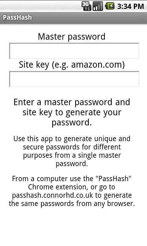 PassHash allows you to generate unique, secure passwords for every site you visit from one master password. This app is made to compliment the Chrome extension "PashHash" and allow you to generate your passwords while not at your computer.