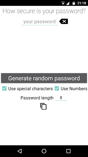 With this app you can check your password security and generate new ones. Never check your real passwords, because your password is displayed in plain text and because you should never reveal your real passwords. We do not guarantee for the calculated values because the app only covers brute-force attacks and not e.g. dictionary attacks. The app informs you if your password is very popular. Generated passwords do always contain lowercase and uppercase letters. All 26 letters of the latin alphabet are supported. All calculations are done offline and on your phone. The source code is licensed under CC-BY-NC license. Visit https://creativecommons.org/licenses/by-nc/4.0/ for more information. The sources can be found here: https://github.com/10MINT/password-checker-sources