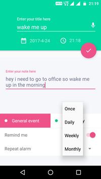 - Customise your reminder in your own way with repeat options once, daily, weekly, monthly.