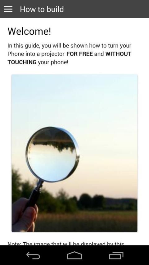 In this app, you will be shown how to build a case for your Phone so you can project the screen of your phone for free without damaging anything! You don't even need an external energy source!