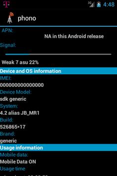 It also provides information about the telephone network and roaming info, signal strength, data network with its state of the connection, the hardware and the operating system of the device.