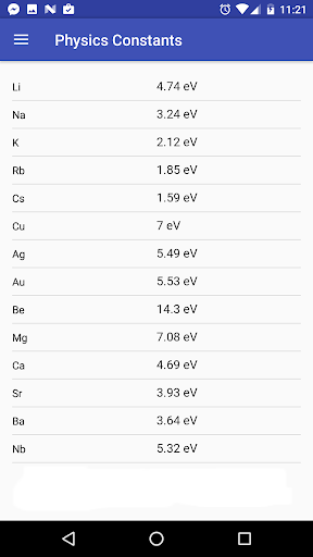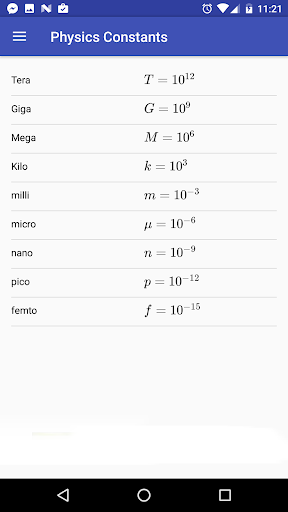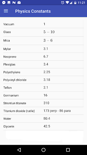 The Physics Constants is a useful app where many common constants are categorized into Classical Mechanics, Thermal Dynamics, Optics, Electromagnetism, Nuclear Physics as well as some other tables of conversions for Length, Time and Mass units.