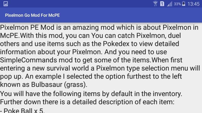 يمكنك التقاط Pixelmon، مبارزة الآخرين والمواد ذات الاستخدام مثل Pokedex لعرض معلومات تفصيلية حول Pixelmon الخاص بك. وتحتاج إلى استخدام SimpleCommands وزارة الدفاع للحصول على بعض من items.When دخول أول عالم البقاء على قيد الحياة الجديدة فإن قائمة اختيار نوع Pixelmon يطفو على السطح.