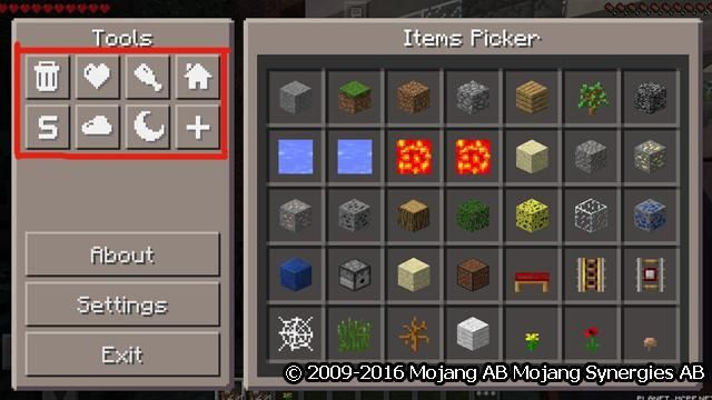 وعلى اليسار هناك بضعة أزرار مختلفة والتي تمكنك من تغيير gamemode، والطقس، واستعادة الصحة والجوع ووضع spawnpoint الجديد.