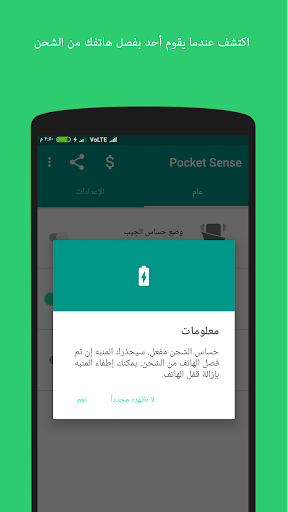 هل تشحن هاتفك في مكان العمل أو غرفة السكن؟ هل تريد أن تعرف عندما يستخدم أحد هاتفك؟ فعّل وضع حساس الشحن في التطبيق. سيتم تنبيهك حالما يقوم أحد بفصل الهاتف من الشحن.