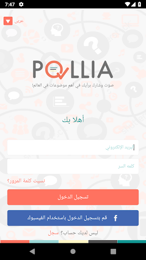 ببساطة قم بالتسجيل في Pollia من خلال عملية التسجيل السريع الخاصة بنا أو ببساطة استخدم حسابك على Facebook. سيستغرق الاشتراك بضع ثوانٍ فقط ، لذا اشترك اليوم وابدأ التصويت وشارك برأيك في أفضل استطلاعات الرأي في العالم!