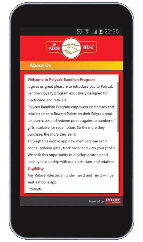 والمقصود Polycab باندان موبايل التطبيق حصريا لأعضاء البرنامج Polycab باندان أي لدينا كهربائى والتجزئة الخاصة جدا. التطبيق المحمول هو مرفق المقدمة لأعضاء قسط انتماءنا إلى الذهب والفضة فئة. يعطي التطبيق المحمول أعضائنا مرفق لتسجيل رمز، استرداد من مجموعة واسعة من المنتجات من كتالوج، عرض تفاصيل البرنامج والكتابة لخدمة العملاء لدينا.