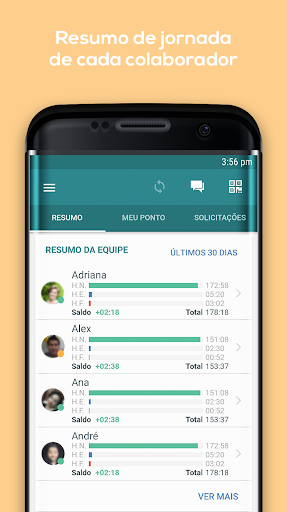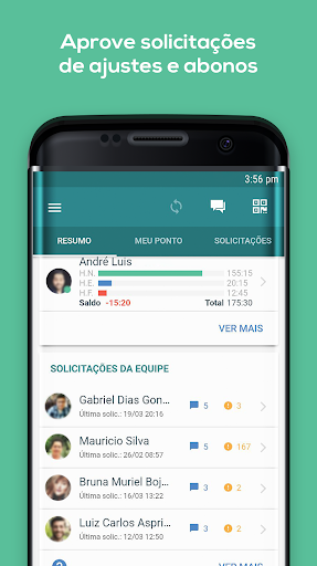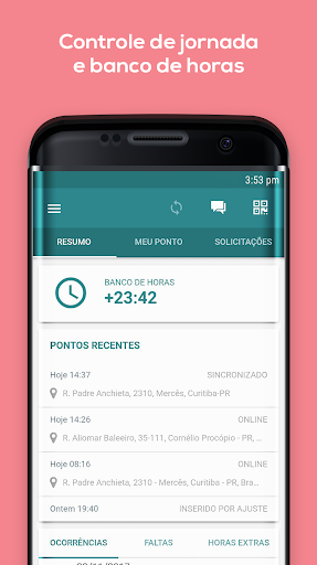 الوصول إلى المعلومات: سيكون كلا المستخدمين والمديرين قادرين على استشارة مؤشرات التواجد والتأخير والساعات البنوك والتغيب عن طريق التطبيق. تحذيرات وإخطارات: التطبيق يرسل الإخطارات التلقائية إلى هاتفك المحمول، وإبلاغك إذا نسيت أن تضرب النقطة، إذا كان هناك رحلات غير مكتملة، لكنها غير تصحيح، من بين أمور أخرى. يمكن أن يكون التطبيق أيضا شكلا من أشكال المديرين لمرافقة أوقات الفريق المتنقلة، وموظفي الاستعانة بمصادر خارجية، والمكاتب المنزلية والموظفون المنزليين والموظفون المنزليين وبعد بالإضافة إلى ذلك الوقت، يحتوي المدير الوصول إلى موقع المتعاون في وقت العلامات. سيتلقى المدير هذه المعلومات والموافقة عليه أو لا، أيضا عن طريق الهاتف الخليوي أيضا.
