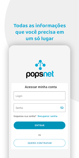 تطبيق للوصول إلى خدمة المستهلك PopSnet. إنها أداة يمكنك من خلالها جعل مشكلات النسخ الثانية ، أو تحليل المستهلك يوميًا أو شهريًا لاتصالاتك ، وجعل الدفع الشهري عبر الإنترنت ، وبروتوكولات العرض وسلامة الويب الكتيب وفقًا للوائح Anatel ، من بين أخرى سمات