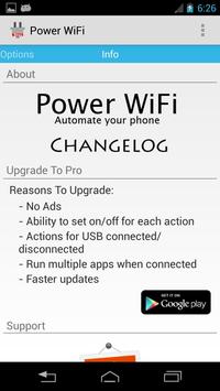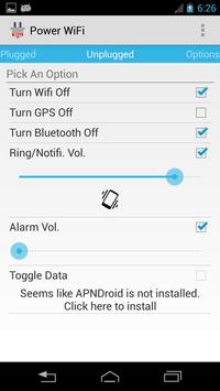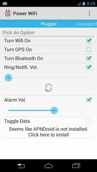 Power WiFi automatically toggles your favorite settings when your phone goes into charging. Currently we allow changing of WiFi, Bluetooth, GPS, Ring/Notification/Alarm Volumes, and Mobile Data.