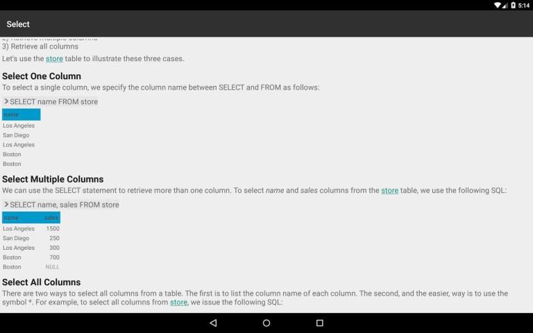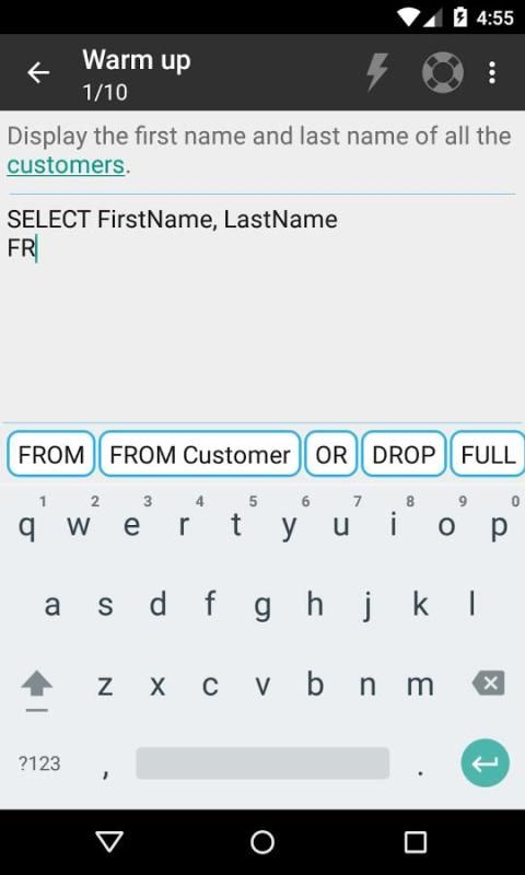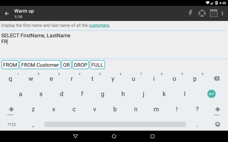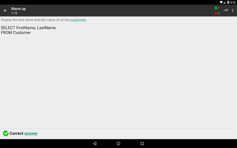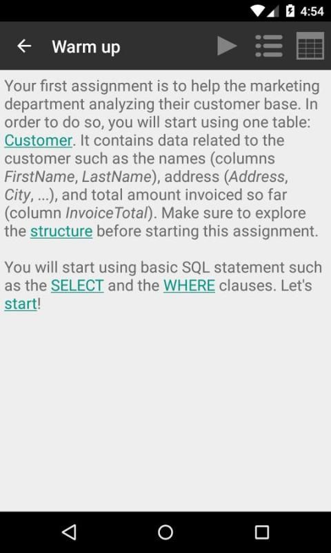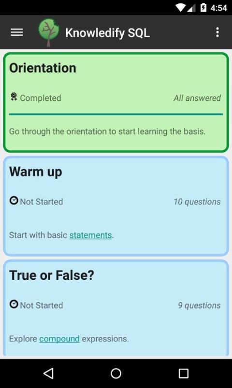 يجب ممارسة SQL أيضا أن تكون خالية من المتاعب و(نعم!) متعة. مع Knowledify، سوف يلعب دور موظف استأجرت حديثا. من خلال سلسلة من المهام أكثر وأكثر تعقيدا حول نظام قاعدة البيانات الجديد الذي قمت صاحب العمل الجديد قد نشرت، سوف تتحرك صعودا داخل الشركة وتصبح بارع في فن SQL.