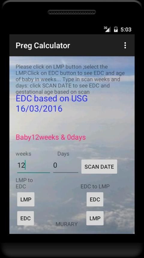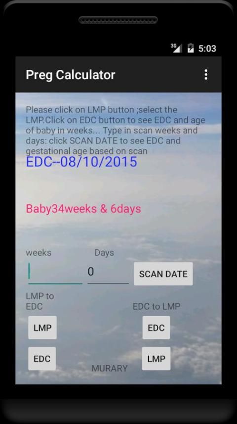Press SCAN DATE button and choose date in witch scan is done.click ok ;EDC of baby and age of baby as on today shall be displayed in the app.