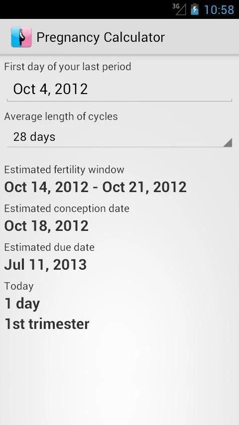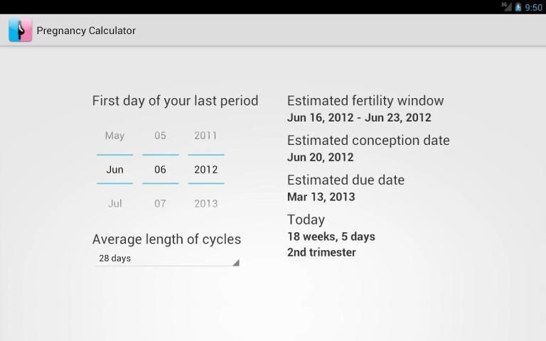 تحميل هذا حاسبة الحمل على الجهاز الخاص بك، وعليك أن تكون دائما قادرة على تحديد تاريخ الحمل، مدى طول انت وتاريخ الاستحقاق التقديرية لطفلك. الحسابات التي تم توفيرها هي تقديرات تعتمد على المعدلات.
