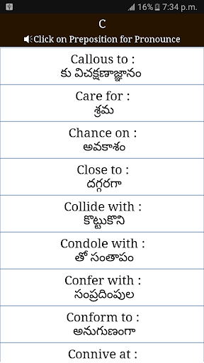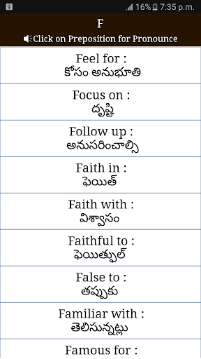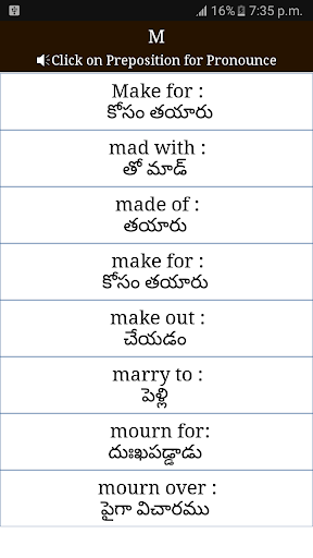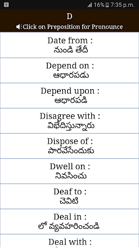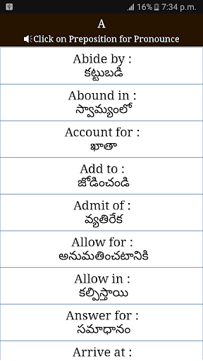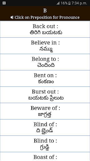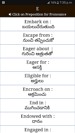 In This App you will get appropriate prepositions with Telugu Meaning and English Pronounce