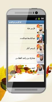 أية الكرسي بصوت كل من فارس عباد, عبدالباسط عبدالصمد, إدريس أبكر, مشاري بن راشد العفاسي, احمد بن علي العجمي, سعد الغامدي, عبد الودود حنيف, محمود خليل الحساري, عبدالله الجهني, ناصر علي القطامي, ماهر المعيقلي, محمد المحيسني, ريان الدوسري, عبدالرحمن السديس, محمد طه