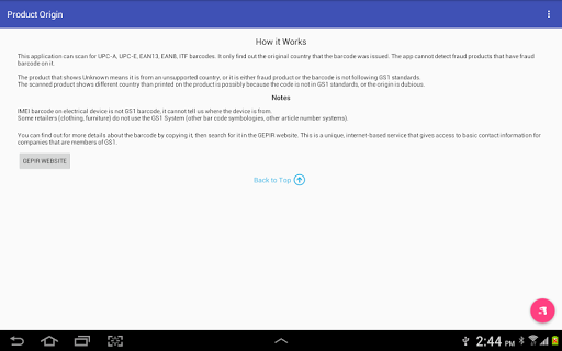 المتطلبات: دقة الكاميرا هي 5.0 ميجابكسل وما فوق. وصف التطبيق: سيخبرك هذا التطبيق من أين هو بناءً على معايير GS1. يمكنك أيضًا نسخ الباركود الممسوحة ضوئيًا بسرعة والبحث عنه في موقع Gepir على الويب (مزيد من التفاصيل حول كيفية عمله). جيد.شكرًا لك.