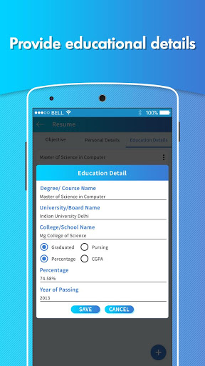 استئناف هو الانطباع الأول للباحثين عن عمل. سيساعدك تطبيق Builder Resume - Job CV Maker على إنشاء وتنسيق التنسيق المهني وإجراء وتحريره في تنسيق PDF بسرعة. السيرة الذاتية المظهر المهنية أمر لا بد منه يجب أن يكون عند التقدم بطلب للحصول على أي وظيفة، والمقابلة، وصيد العمل، والبحث عن وظيفة، وتقدم للحصول على وظائف في موقع العمل وما إلى ذلك.
