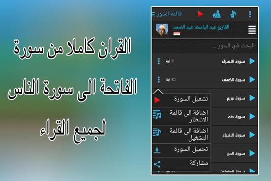 يحتوي التطبيق على 50 قارئ من افضل قراء العالم الاسلامي، كل قارئ توجد جميع تلاواته من سورة الفاتحة الى سورة الناس