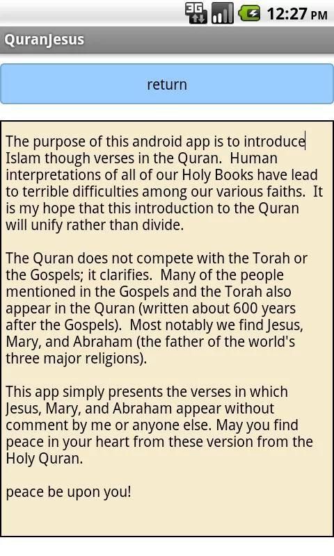 هذا التطبيق يعرض ببساطة الآيات التي في يسوع، مريم، وإبراهيم تظهر في القرآن دون تعليق من قبلي أو أي شخص آخر. قد تجد السلام في قلبك من هذه النسخة من القرآن الكريم.