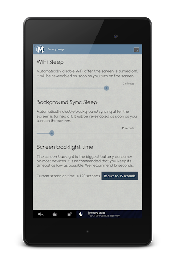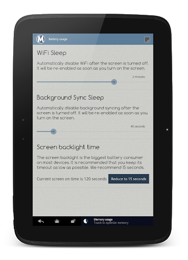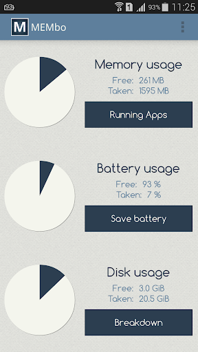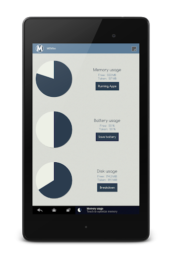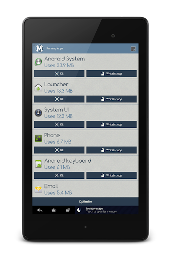 MEMbo kills those memory hogs and makes your Android usage smooth and fast again. Don't wait for those nasty "out of memory" warnings and "app not responding" popups. Stop them with a single tap and take back the control of your device's memory.