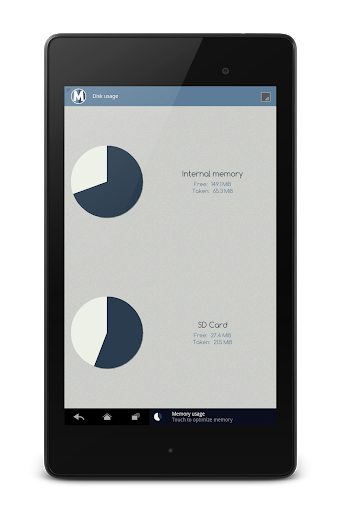 Overview of the available free and taken space in your device's internal memory and SD card.