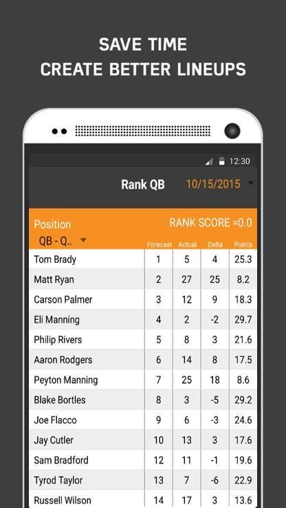 RANKUP helps to improve the accuracy of your player rankings too, which will lead to better lineups and earning more money. The ranking performance page scores your football player ranking accuracy at each position. Track your ranking performance live as the games are going on. See real-time updates of player points and track how well you did at ranking players each week. Compete with your friends to see who has the better rank score and who is better at fantasy football. Leverage your results to identify weaknesses and improve your performance.