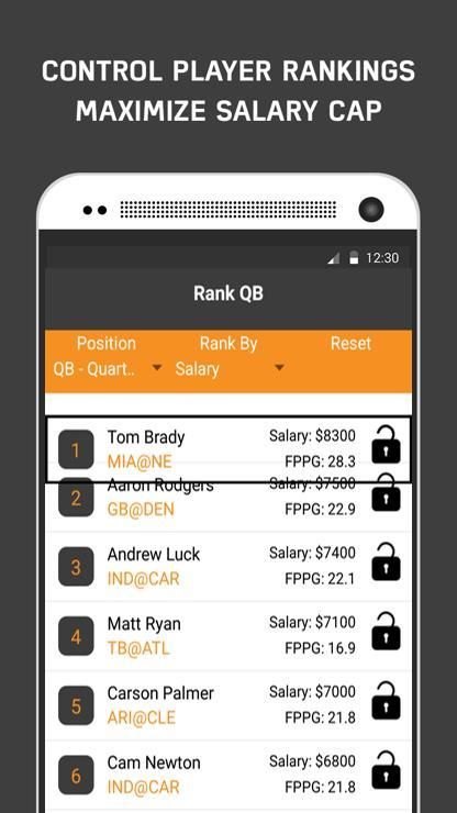 You’re in control with RANKUP. Control player rankings- lean on expert rankings or create your own custom rankings. Control your lineup- experiment with different player rankings until you find your winning lineup. Control your winnings- maximize your salary cap and eliminate bad plays. Control your DraftKings experience- save time, focus on player rankings, eliminate math and have fun.
