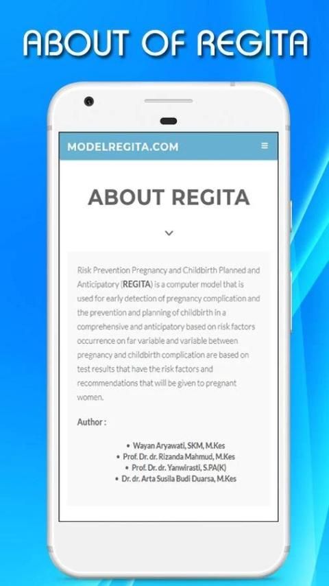 الحمل الوقاية من المخاطر والولادة المخططة والتحسبي (REGITA) هو نموذج الكمبيوتر التي تستخدم للكشف المبكر عن مضاعفات الحمل والوقاية والتخطيط للولادة بطريقة شاملة وتوقعية على أساس عوامل خطر حدوث على متغير الآن والمتغير بين الحمل والولادة تستند مضاعفات على نتائج الاختبار التي لديها عوامل الخطر والتوصيات التي من شأنها أن تعطى للنساء الحوامل.