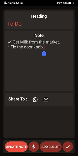 Notes & To-do Suits - هذا القسم سيساعدك على البقاء in-sync وتنظيم بحيث يمكنك التركيز على ما يهم. قم بإجراء الملاحظات، والقوائم المهمة، وقوائم المراجعة أو قوائم البقالة أو التسوق، إلخ ووضع علامة عليها كما تم القيام به للحفاظ على Track.Share هذه الملاحظات على WhatsApp أو إرسالها كبريد إلكتروني.