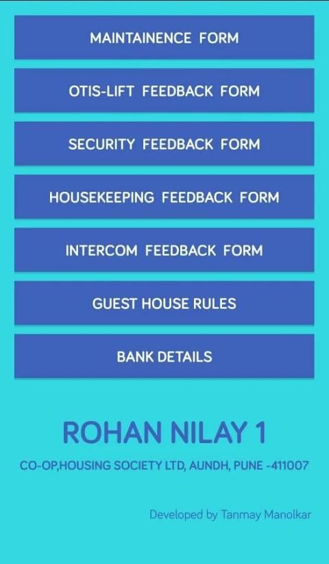 This application is developed to help the residents of ROHAN NILAY 1 soc, to register their complaints and feedbacks at the society office.