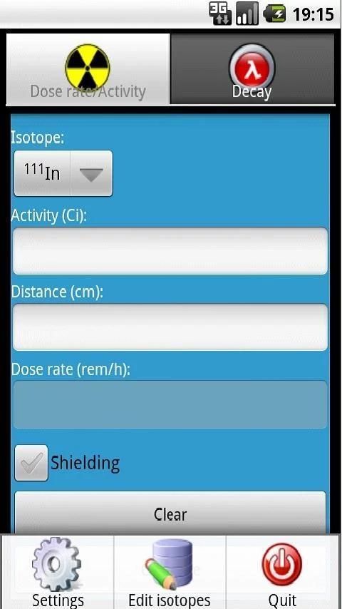 The app calculates dose rates etc. assuming a point source in vacuum and linear attenuation in shielding materials. Isotopes and shielding materials can be added, deleted or modified.