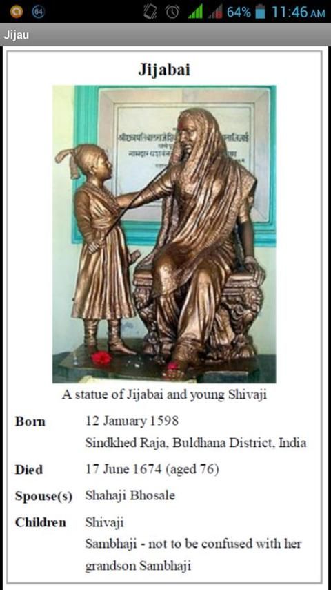 Rajmata Jijau هو تطبيق الروبوت الذي يخدم المعلومات حول حياة Rajmata Jijau باللغة الإنجليزية .. التطبيق يحتوي على معلومات وصور.