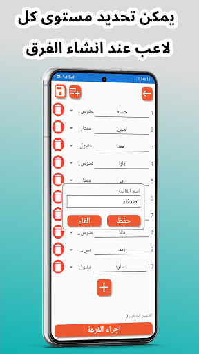 - انشاء فرق , توزيع اللاعبين على فرق , عند اختيار اعدادات القرعة قم بختيار مستوى لاعبين مختلف ليقوم التطبيق بتوزيع اللاعبين بشكل عادل بحيث يقوم بتوزيع اللاعبين ذوي مستوى ضعيف على الفرق بشكل منصف.