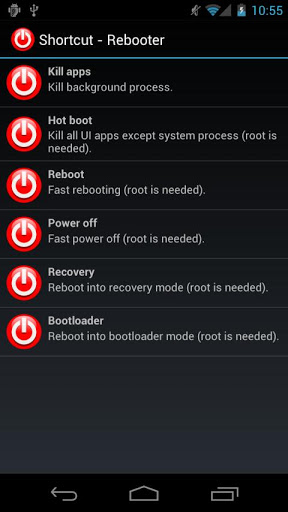 task killer and fast rebooter.Kill background processes just like task killer. Reboot in just a few seconds.You cat reboot easily amp; quickly.You can use Kill apps or Hot boot instead of task killers.Features: Kill appsbackground apps with white list Fast Hot BootKill all UI apps except system process:root is needed. Fast Rebootroot is needed. Fast Shutdown root is needed. Reboot to Recovery root is needed. Reboot to Bootloader root is needed. Home screen shortcuts for kill apps and reboot.Long tab empty home screen gt; Shortcuts gt; Select Rebooter icontags reboot boot recovery bootloader fastboot hotboot task killer