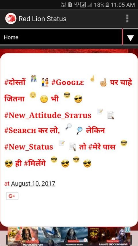 الأحمر الأسد الحالة هو مجاني تماما وأفضل تطبيق الحالة الهندية لجميع الناس الذين يحبون لتحديد أفضل الأحوال والهندية ونقلت في الفيسبوك، واتس اب وسائل الإعلام الاجتماعية الأخرى.