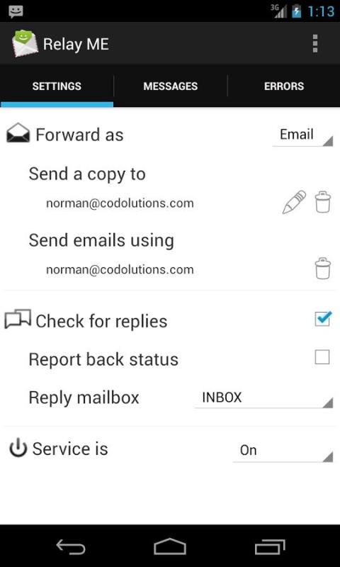 تم تطوير هذا التطبيق مع الأمن والخصوصية في الاعتبار. النصوص الخاصة بك السفر إلا من خلال بوابة إلكترونية خاصة بك، وليس من خلال خادم وسيط. ومع ذلك، فإن الصيد هو، تحتاج إلى توفير الخاصة بوابة البريد الإلكتروني الخاص بك، سواء كان ذلك على حساب بريد جوجل مجانا أو SMTP / IMAP دعم حساب آخر (ياهو، يعيش، أو الخادم الخاص بك). لم نحصل على رؤية النصوص الخاصة بك. بالإضافة إلى ذلك، رد تعمل طالما الهاتف الخاص بك هو واتصال بالإنترنت. وهذا يعني إذا ينام هاتفك، وسوف تتأثر الردود الخاصة بك.