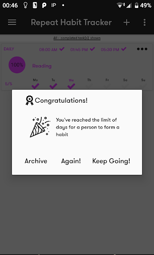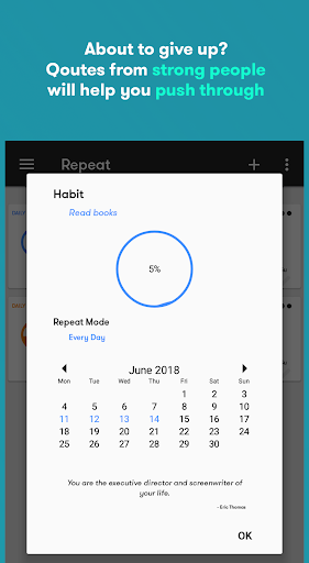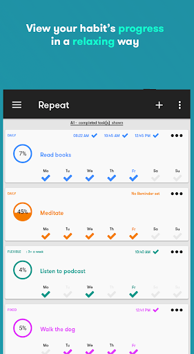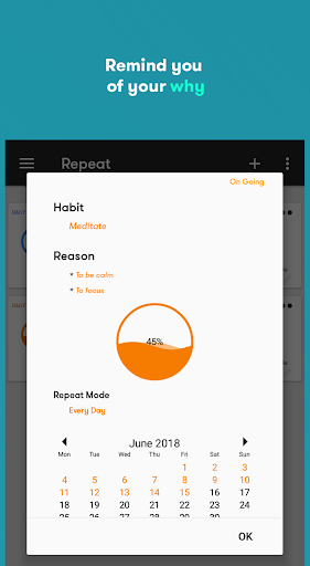 It takes 70 days to form a habit, Repeat will remind you and will notify you if you have a pending habit on a given time.