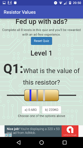 * This app doesn't send collect or store any personal data - everything is stored on your phone. If you clear your app data you will lose your quiz progress and ads will appear again. I also reserve the right to add extra levels in future updates to stretch your resistor skills even further.