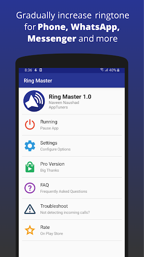 Ring Master automatically increases your ringtone gradually so that you can avoid sudden shocks from loud ringtones. Set the amount of volume you want to increase and Ring Master will take care of the rest. You can even set it to