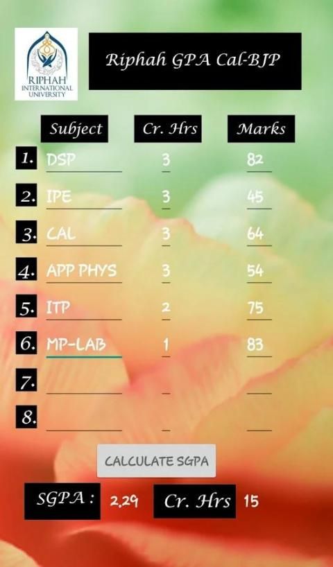 يمكنك حساب الخاص بك sGPA، المعدل التراكمي، والمعدل التراكمي عن طريق تحسين F أو D grade.The تفاصيل الدرجات أيضا given.You ديك لإدخال علامات بك من أصل 100.