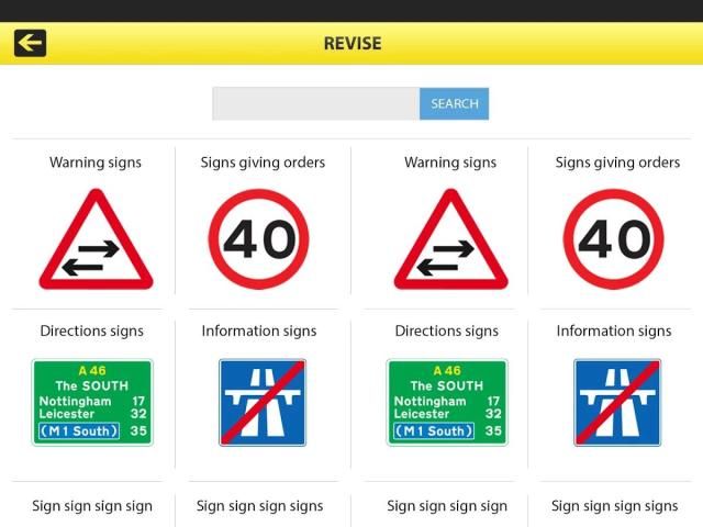 يمكنك الوصول إلى علامات الطرق اختبار على شبكة الإنترنت: http://theory.1driver.co.uk/traffic-sign-quiz/