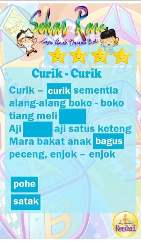 في هذا التطبيق هناك 12 الأغاني الشعبية بالي، بما في ذلك اللحية Uban، Cening بوتري أيو، مواء، مواء،