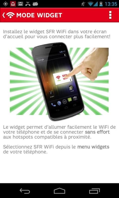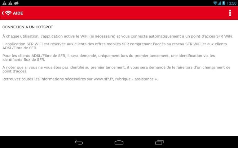 واي فاي تطبيق SFR متاحة للعملاء SFR مربع كما في زبائن خدمة الهاتف النقال مع بطاقة SIM SFR مع الاشتراك في السماح بالوصول إلى خدمة واي فاي SFR الآن. سوف لADSL / الألياف أن يطلب العملاء SFR فقط عند إطلاق أول، وتحديد معرفات عبر صندوق SFR.