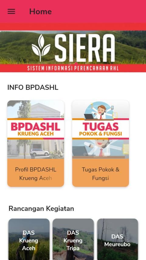 SIERA adalah sebuah aplikasi yang menyediakan layanan data dan informasi perencanaan kegiatan Rehabilitasi Hutan dan Lahan (RHL) lingkup BPDASHL Krueng Aceh. Aplikasi berbasis play store ini dibuat dengan harapan dapat memberikan informasi seluas-luasnya kepada semua pihak terkait yang lebih transparan, akuntabel serta dapat diakses kapan saja oleh siapapun.