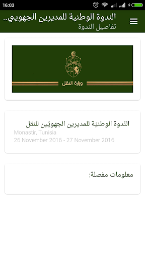 مرحباً بكم في التطبيق الرسمي للندوة الوطنية للمديرين الجهويين للنقل في 26 نوفمبر 2016 و اليوم الوطني للمراقبين في 27 نوفمبر 2016 بالمنستير - تونس. نتمنى لكم ندوة ناجحة. هذا التطبيق من إنتاج شركة eMobile Technologies - mEVENTS .