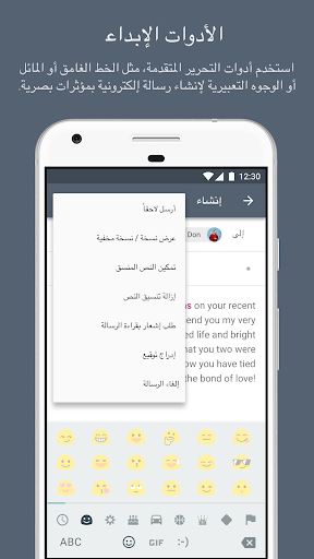 محرر النصوص الغني مع الإيموجي (الرسوم التعبيرية) - اجعل بريدك الإلكتروني مميزاً من خلال استخدام خاصية محرر"ما تراه هو ما تحصل عليه" المعد في التطبيق. بإمكانك من خلال هذه الخاصية جعل الخط غامقاً أو مائلاً أو تظليل النص أو تغيير لونه.