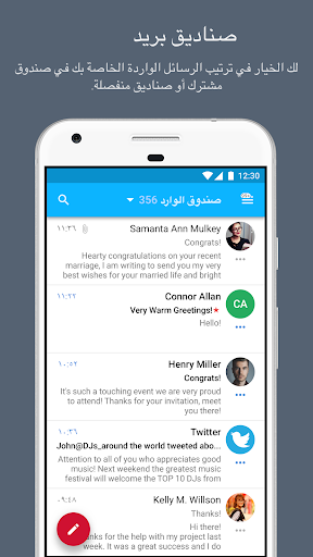 جميع الحسابات في حساب واحد - سيكون بمقدورك إدارة كافة رسائل البريد الإلكتروني الواردة في مايكروسوفت إكستشينج وبريد جيميل وتطبيقات غوغل وأوت لوك وأوفيس 360 وياهو! وبريد AOL وآي كلاود أو أي خادم (IMAP) آخر.