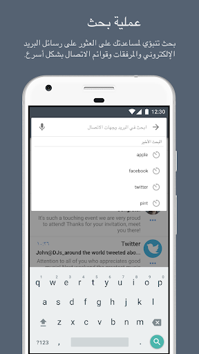 البحث الذكي - يوفر التطبيق خدمة بحث تنبؤية فعالة تتيح لك العثور على أي رسالة بريد إلكتروني أو جهة اتصال أو مرفق بسرعة وبدقة سواء كان مخزناً في البريد الإلكتروني أو في الخادم. ويعرض التطبيق خيارات البحث عن طريق المرسل، الموضوع، كلمة رئيسية، نطاق البيانات، مجلد بالإضافة إلى خيارات أخرى تساعدك على إيجاد ما تبحث عنه بسرعة.