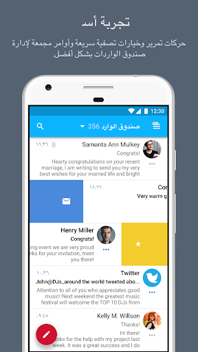 صندوق واردات مرئي - أضف صور للملف الخاص بجهات الاتصال المسجلة لديك حتى تتمكن من تحديد البريد الإلكتروني المرسل من أشخاص مهمين بسرعة. يعرض صندوق الواردات الخاص بالتطبيق صورة المرسل وأيقونات من الخدمات الأكثر رواجاً على الويب حتى تتمكن من التعرف على المرسل بلمح البصر.