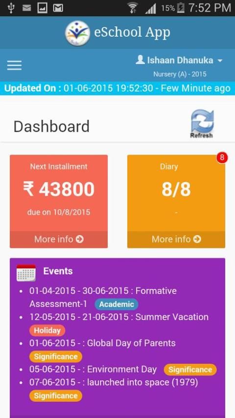 eSchool هو حالة من تخطيط موارد المؤسسات وإدارة المدرسة الفنية التي تساعد المدرسة إدارة وظائف معقدة مثل الرسوم، والنتائج، والحضور، ومكتبة، والأوراق المالية، والجدول الزمني، والموظفين، والمرتبات، والإخطارات، عالم، والوثائق، والنقل، والفحص على الانترنت، نزل، وما إلى ذلك. eSchool التطبيق هو الهاتف المحمول / قرص أداة اتصال الثورية بين المدرسة وطلابها وأولياء أمورهم مما يساعد على إبقاء الآباء على علم وسعيدة وأعجب.